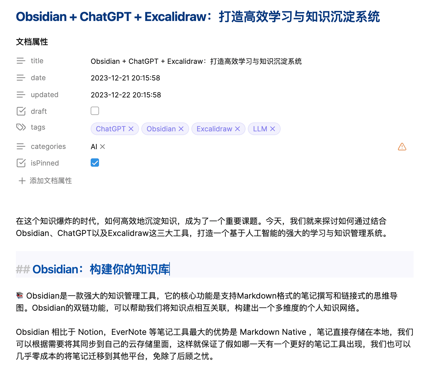 首先,我选用了 Obsidian 作为我的知识管理工具。它提供了卓越的 Markdown 编辑和链接功能,使我能轻松整理和查询我的知识库。例如,下图展示的就是我已经发布到博客上的一个笔记。