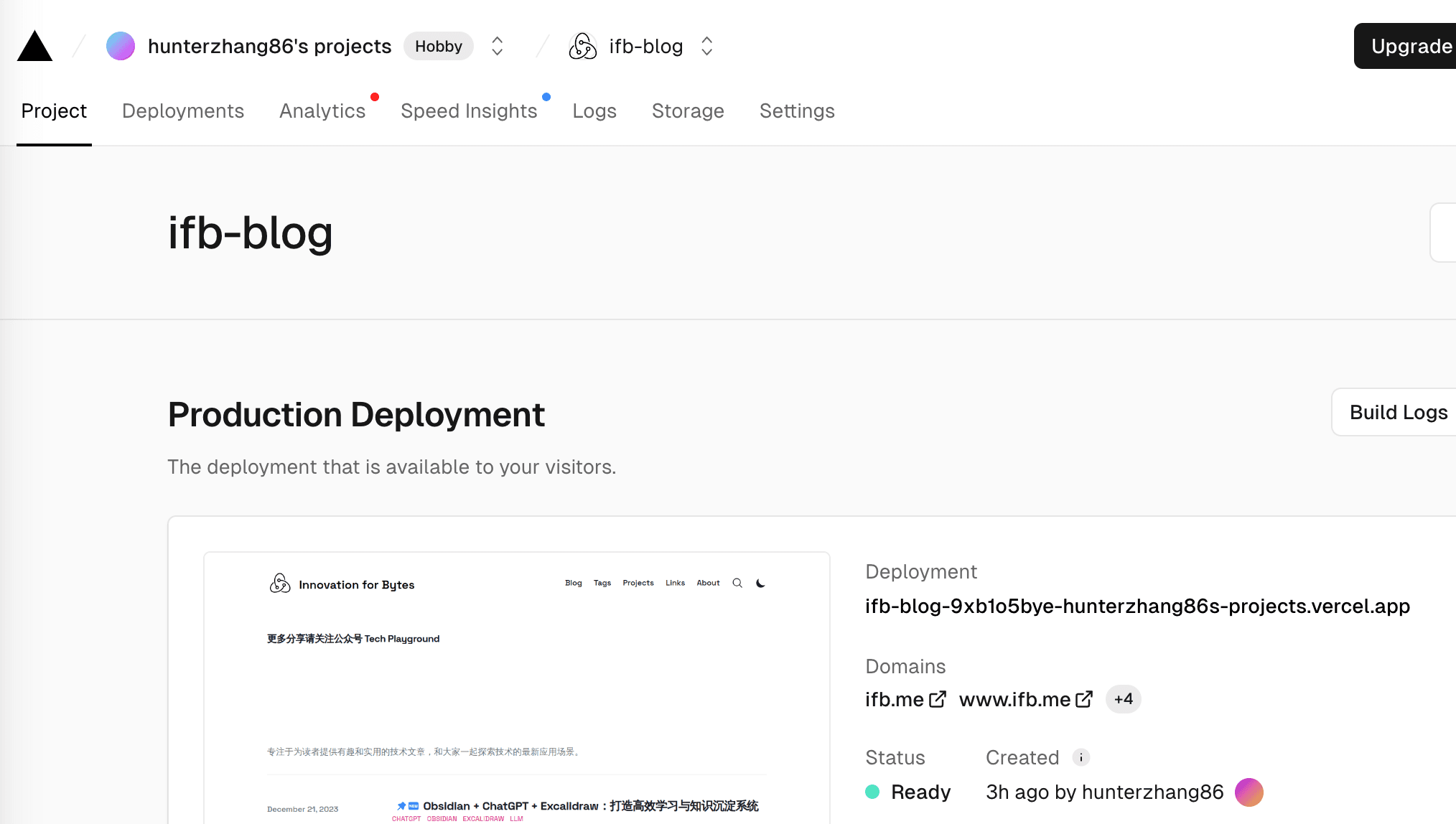 部署完成后,Vercel 会实时监控 GitHub 上的博客代码仓库。一旦出现任何变更,我的博客便会自动更新。