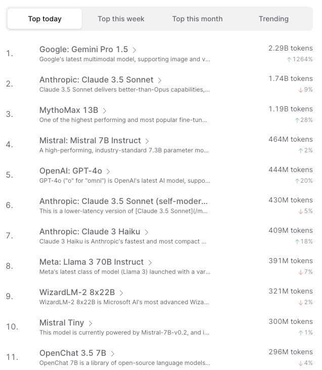 最重要的,你可以根据自己的实际情况选择需要使用的模型,有些甚至是免费的,OpenRouter Ranking