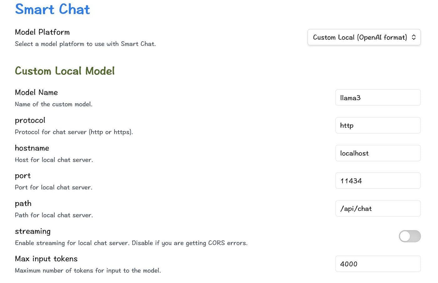In the plugin configuration page, fill in the settings as shown below. Pay special attention to ensure that the Model Name matches the name of the model you installed exactly. This is because, when using the Smart Chat dialog, the model name will be passed as a parameter to Ollama. The hostname, port, and path use the default settings here, and you should follow the same if you have not customized In the plugin configuration page, fill in the settings as shown below. Pay special attention to ensure that the Model Name matches the name of the model you installed exactly. This is because, when using the Smart Chat dialog, the model name will be passed as a parameter to Ollama. The hostname, port, and path use the default settings here, and you should follow the same if you have not customized Ollama.
