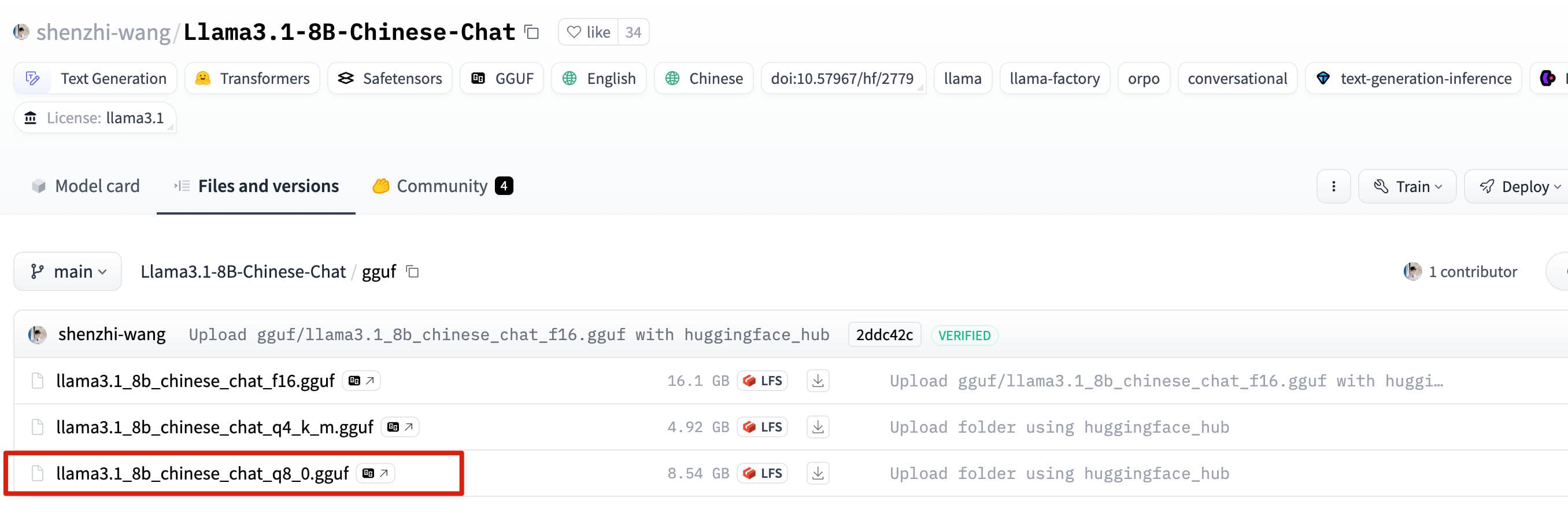 在安装好 Ollama 后,我们可以通过 在安装好 Ollama 后,我们可以通过 Ollama 快速安装 shenzhi-wang 的 Llama3.1-8B-Chinese-Chat 模型。首先在 HuggingFace 里面找到 Llama3.1-8B-Chinese-Chat 的下载页面并下载模型。下载链接: shenzhi-wang/Llama3.1-8B-Chinese-Chat · Hugging Face