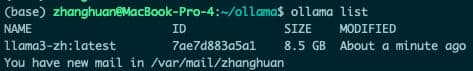 llama3-zh 是我们给模型起的名字,成功导入后可以使用 list 命令查看: