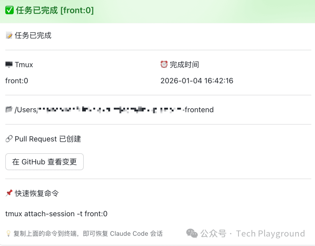 Here's an example of a Claude Code task notification sent via Hook: